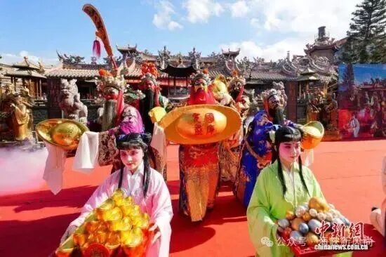 当天,《二十四节令鼓》表演、舞蹈《鱼跃龙门》、高甲戏《五路财神赐宝》等传统民俗节目轮番上演,庄严的古礼和精彩的表演吸引两岸信众以及往来的市民和游客拍照留念。