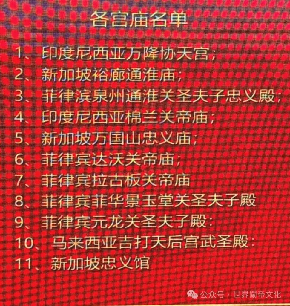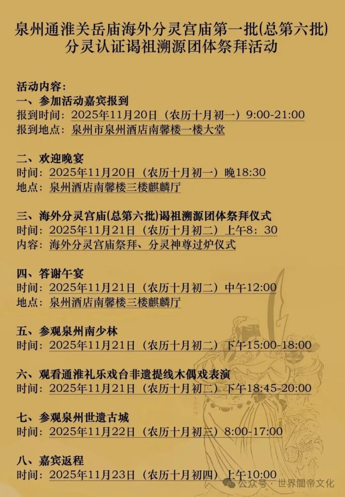 世界关帝文化消息: 公元2025年11月21日,来自菲律宾、印度尼西亚、马来西亚、新加坡等国家的11家海外分灵宫庙代表,齐聚福建泉州通淮关岳庙,参加分灵认证谒祖溯源团体祭拜仪式,表达对关公精神和祖庙的敬仰和崇拜。